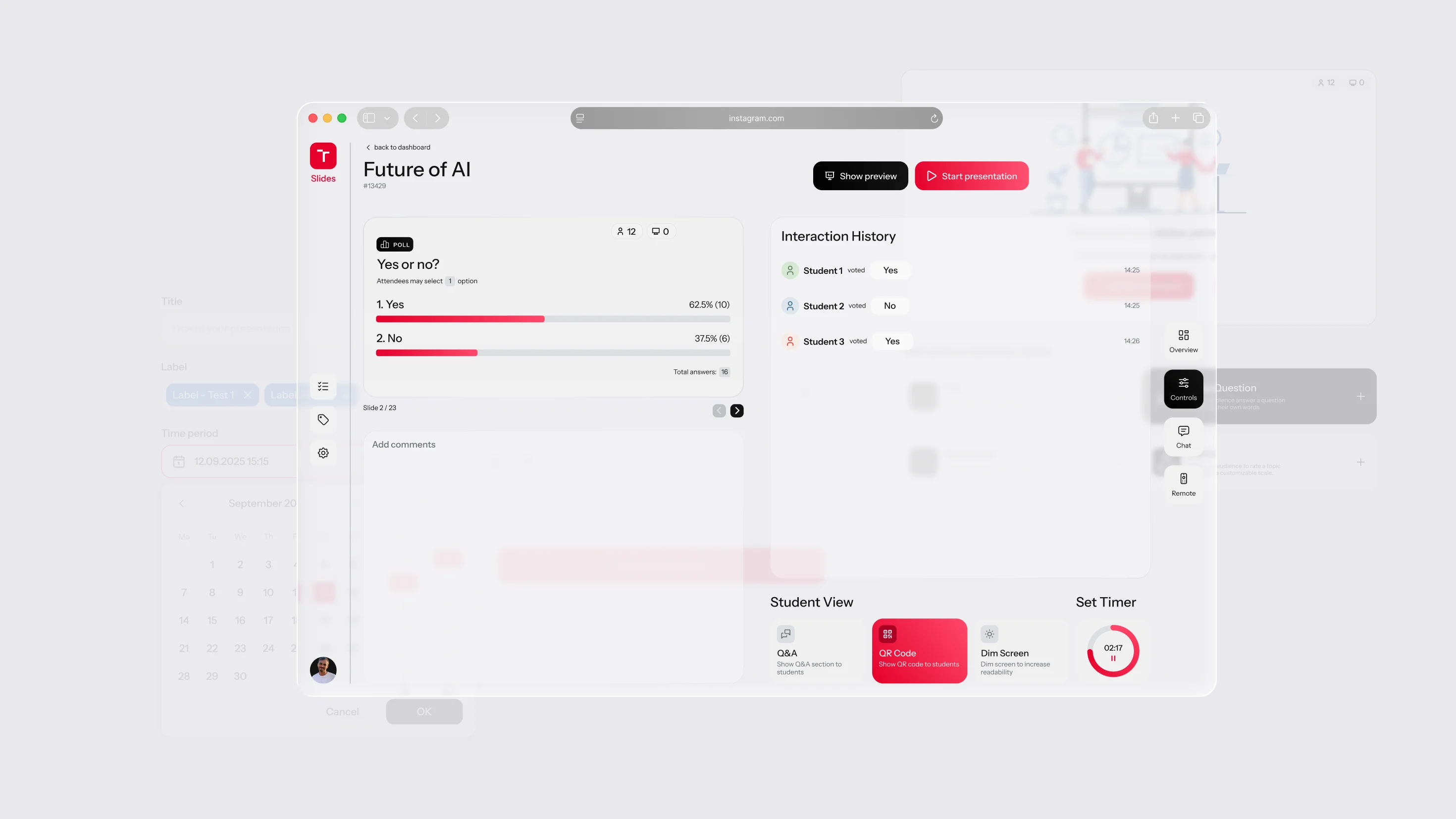 Powered by a real-time interaction engine, VUT Slides transform traditional presentations into dynamic, two-way experiences. From live polls to instant feedback, every slide is designed to respond, adapt, and engage your audience in the moment.