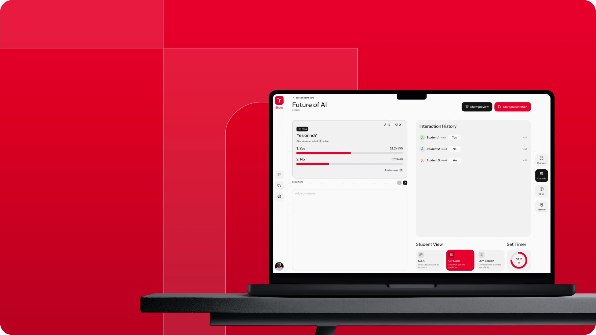 Powered by a real-time interaction engine, VUT Slides transform traditional presentations into dynamic, two-way experiences. From live polls to instant feedback, every slide is designed to respond, adapt, and engage your audience in the moment.